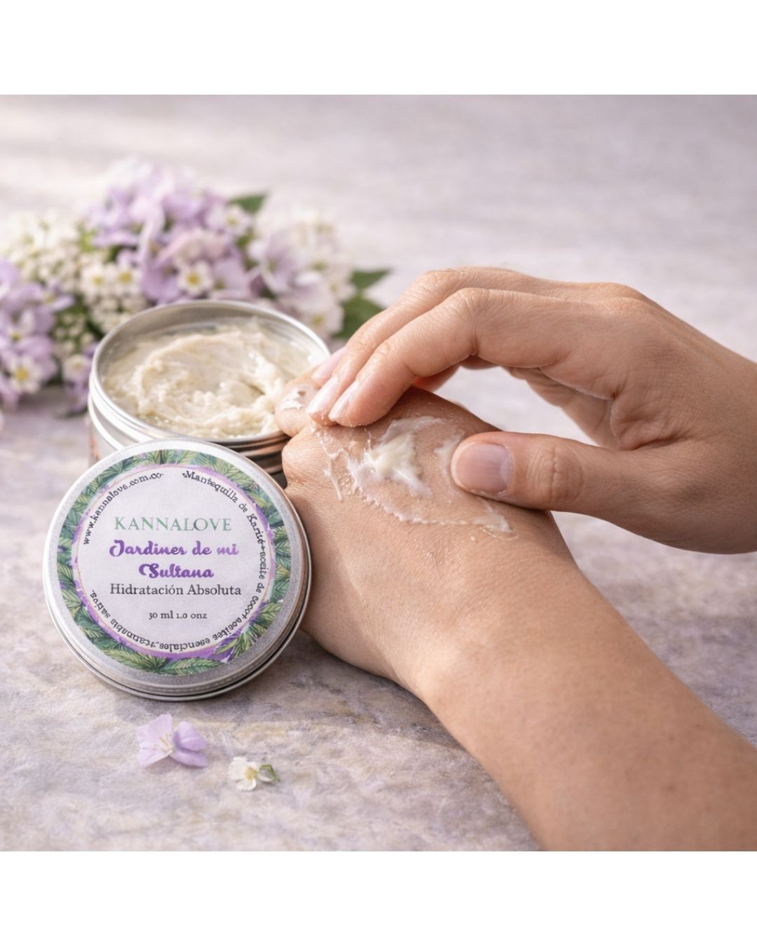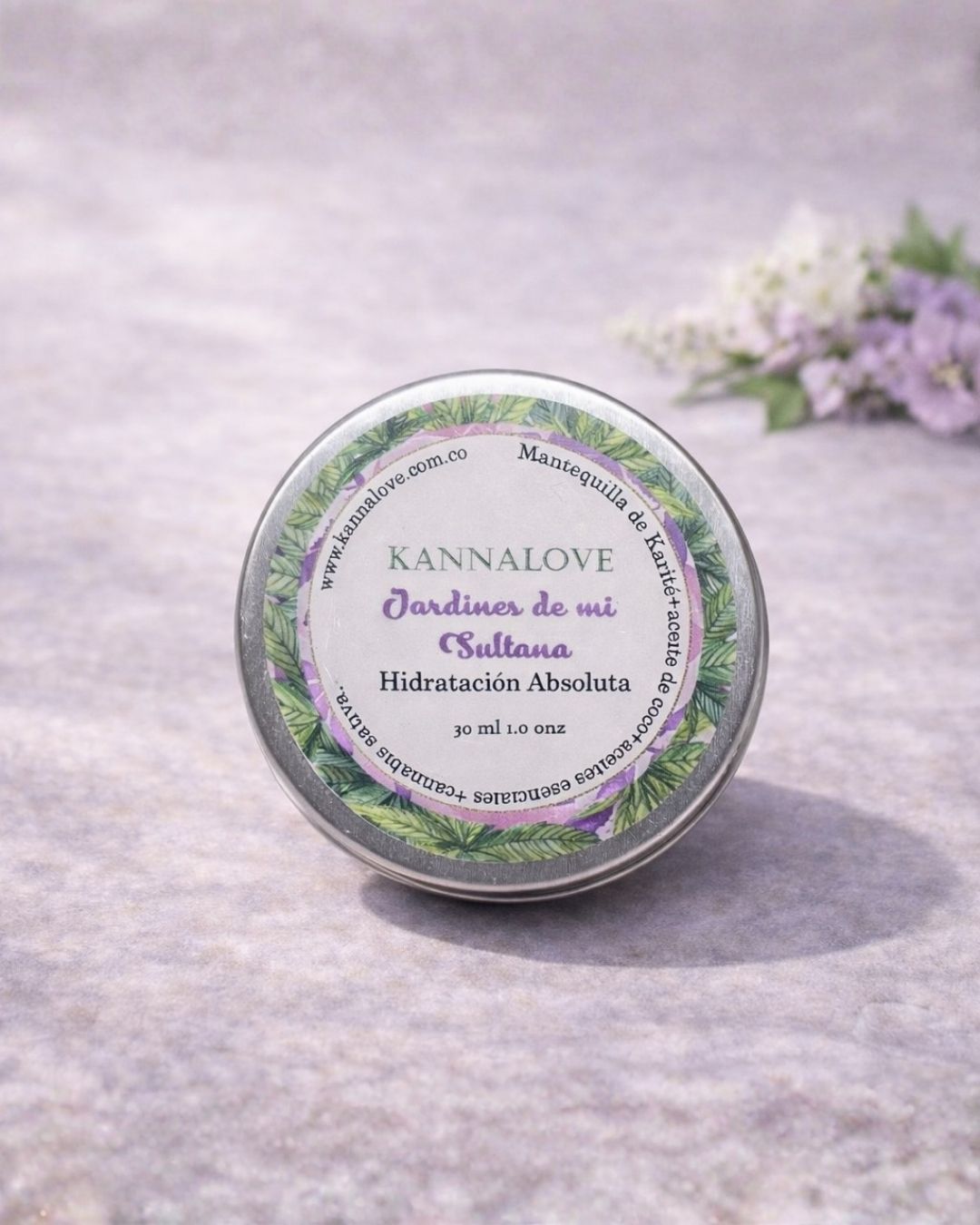 Jardines de mi Sultana es una mantequilla corporal de karité elaborada artesanalmente, infusionada con cannabis y aceite de coco, y enriquecida con aceites esenciales de flores.
