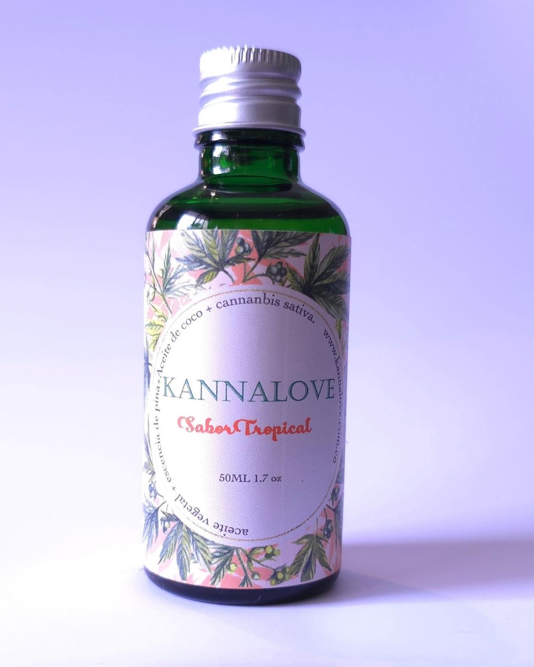 Aceite corporal de cannabis Sueño Tropical de Kannalove con piña, coco y flor de CBD, presentado en envase verde sobre fondo botánico.
